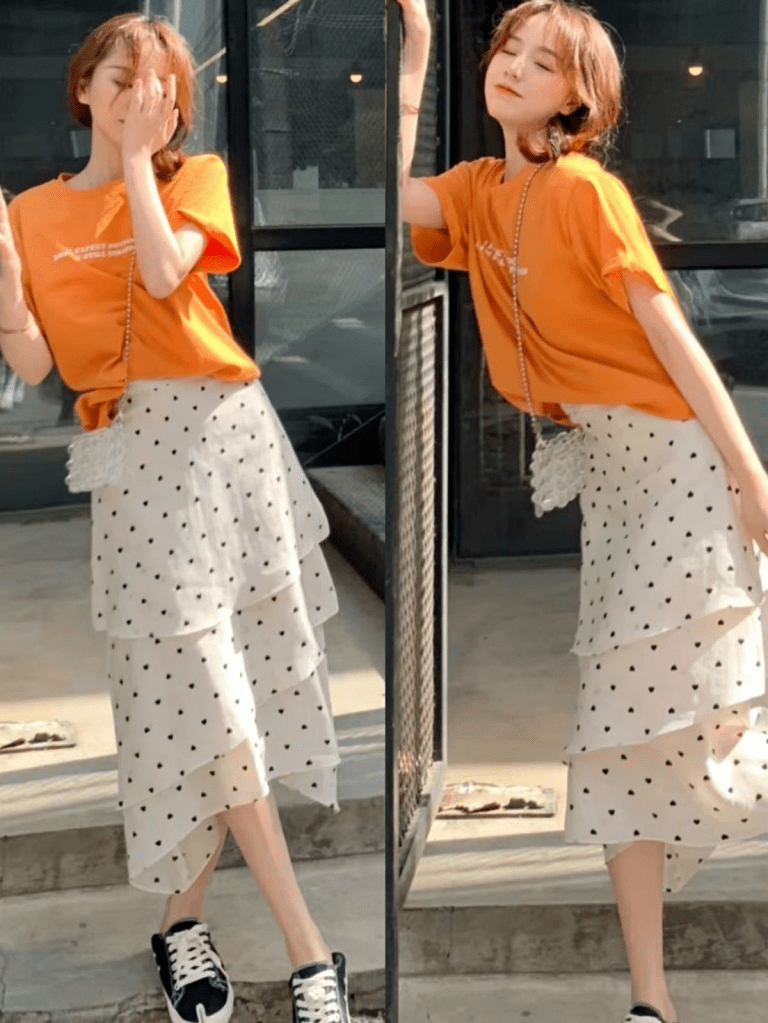 臟橘色的緊身打底衫會顯得上半身的身材非常的完美,優越的曲線會被展現出來,皮質的長裙會顯得腿非常的長,整體看上去非常的高級。